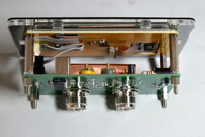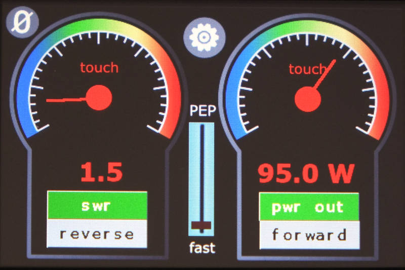 Hier erfolgt die analoge Anzeige der Messwerte durch zwei Zeigerinstrumente und darunter eine genaue numerische Anzeige. Das linke Instrument kann SWR oder rückwärts Leistung anzeigen. Die Auswahl erfolgt durch tippen auf einen der darunterliegenden buttons. Analog dazu kann die rechte Anzeige zwischen power out und vorwärts Leistung umgeschaltet werden.